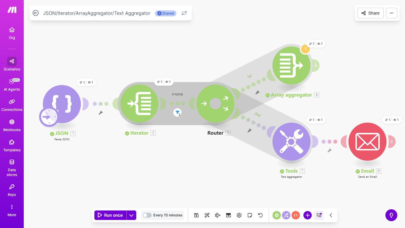 Built an automation workflow that parses structured JSON data, iterates through records, applies routing logic, aggregates results, and generates formatted email outputs automatically.