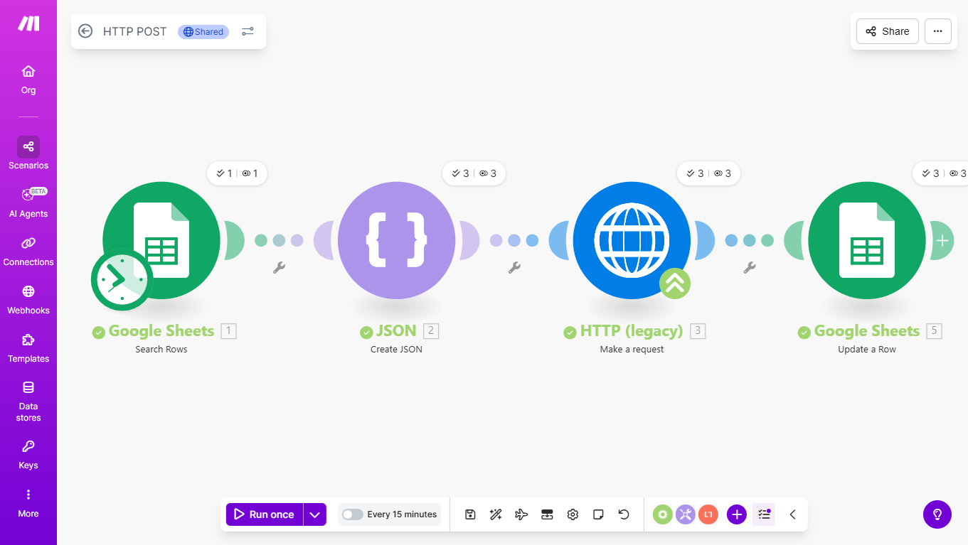 Built an automation that checks Google Sheets for subscription data, applies conditional logic, updates records automatically, and communicates with external systems using HTTP requests and JSON handling.
